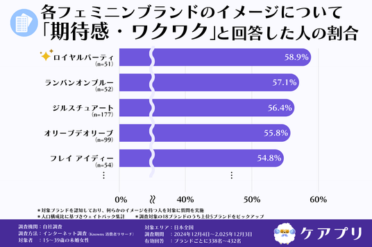 「期待感・ワクワク」のイメージを持つ人の割合は、『ロイヤルパーティ』が58.9%でトップとなりました。次いで『ランバンオンブルー(LANVIN en Bleu)』が57.1%、『ジルスチュアート』が56.4%、『オリーブデオリーブ』が55.8%、『フレイ アイディー』が54.8%という結果でした。