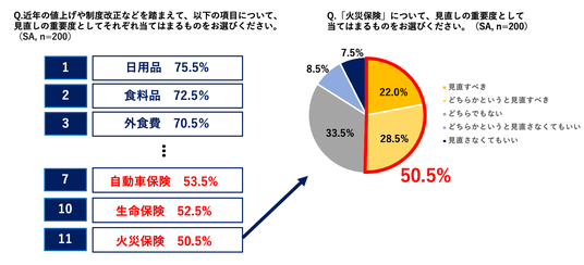 見直すべきと考える項目上位は「日用品」「食料品」「外食費」。「火災保険」も過半数が見直すべきと回答