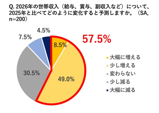 調査の結果、半数以上が2026年の世帯収入が「増加する」と回答する一方で、7割以上が家計状況は「良くならない」との見方を示し、収入の伸びを上回るペースで「値上げ(生活コスト増)」が進行し、実質的な家計の余裕は生まれないと分析していることが明らかになりました。