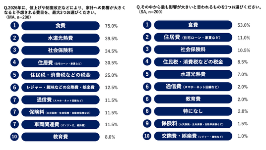 ・2026年に家計への影響が大きくなると予想される項目を聞いたところ、1位「食費(75.0%)」が突出して高い結果に。次いで2位「水道光熱費(39.5%)」、3位「社会保険料(34.5%)」が続き、生活インフラや公的負担の増加が重荷になると予想されている。