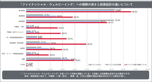 「ファイナンシャル・ウェルビーイング」を理解している投資層は、株・投信に加えて不動産、債券など複数資産を組み合わせる割合が高い。