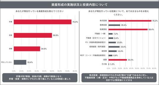 貯蓄・投資・保険など何らかの資産形成を行う人は8割超。一方、投資層の投資対象は株式・投信が中心で、