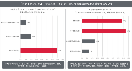 「ファイナンシャル・ウェルビーイング」という言葉は約7割が未認知であることに対し約8割が「重要・やや重要」と回答。