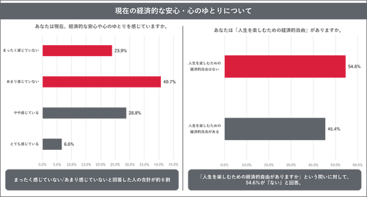 現在の「経済的な安心や心のゆとり」について尋ねたところ、「あまり感じていない」「まったく感じていない」と回答した人は合計で約6割に達しました。また、「人生を楽しむための経済的自由がありますか」という問いに対しては、54.6%が『ない』と回答。