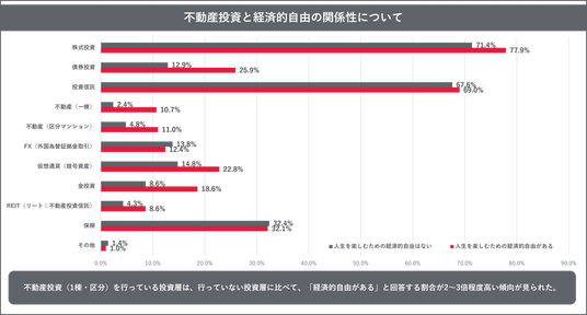 投資商品の内訳と「人生を楽しむための経済的自由」の有無を掛け合わせてみると、不動産投資(1棟・区分)を行っている投資家は、行っていない投資家に比べて、「経済的自由がある」と回答する割合が2~3倍程度高い傾向が見られました。