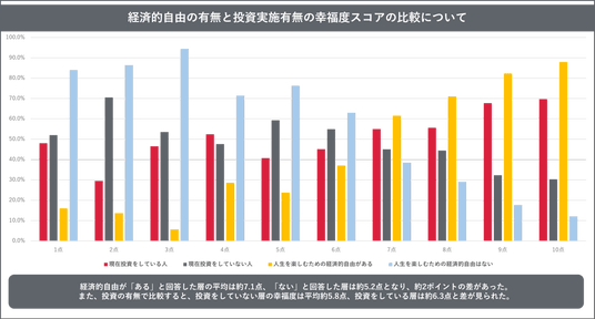 不動産投資や債券など長期安定・価値保全型の資産を持つ投資層は、持たない投資層に比べ「人生を楽しむための経済的自由がある」と