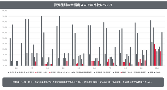 さらに投資している層の中でも、不動産(一棟・区分)などを保有している層では幸福度が7点台と高く、不動産を保有していない層(6点未満)との差が広がる結果となりました。