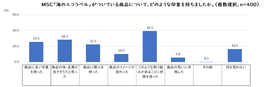 MSCラベル付き商品の例として8点(※)を提示したところ、39.3%が「このような取り組みがあることに好感を持った」、次いで28.3%が「商品の味・品質が良さそうだと思った」と回答しました。