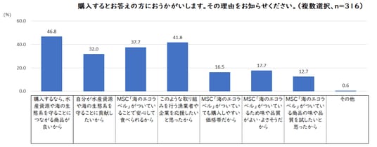 MSC「海のエコラベル」付き商品を購入したいかどうかという質問については、全体の8割近くが「購入した・購入したい」と答えました。その理由は、「水産資源や海の生態系を守ることにつながる商品が良いから」が46.8%、「このような取り組みを行う漁業者や企業を応援したいと思ったから」が41.8%でした。一方で、「購入しない」とした2割の回答者のうち38.1%が、「ふだん購入するお店で目にしないから」とし、次いで36.9%が「購入するかは味や品質次第だから」と答えました。