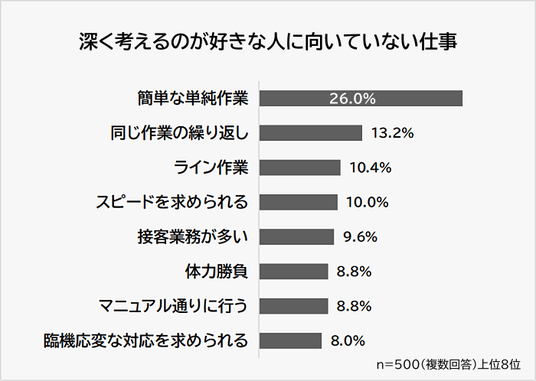 「深く考えるのが好きな人に向いていない仕事の特徴」の1位は「簡単な単純作業(26.0%)」でした。2位「同じ作業の繰り返し(13.2%)」、3位「ライン作業(10.4%)」、4位「スピードを求められる(10.0%)」が続きます。