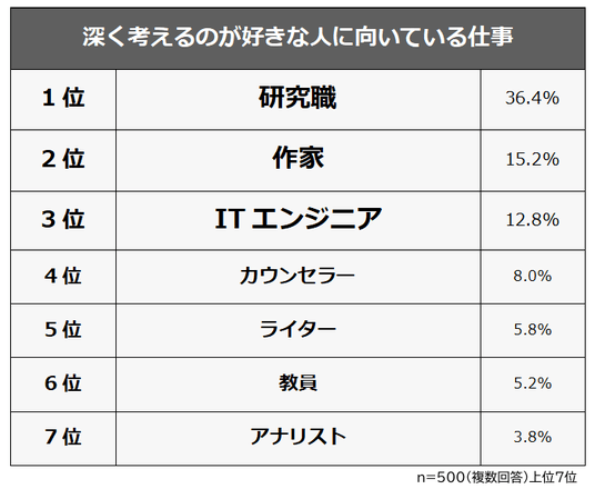 深く考えるのが好きな500人に「深く考えるのが好きな人に向いてる仕事」を聞いたところ、1位は「研究職(36.4%)」で、突出して高くなりました。2位「作家(15.2%)」、3位「ITエンジニア(12.8%)」が続きます。