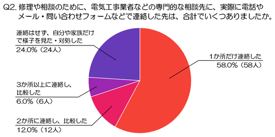 Q2. 修理や相談のために、電気工事業者などの専門的な相談先に、実際に電話やメール・問い合わせフォームなどで連絡した先は、合計でいくつありましたか。