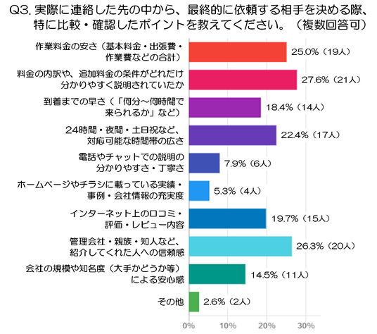Q3. 実際に連絡した先の中から、最終的に依頼する相手を決める際、特に比較・確認したポイントを教えてください。※Q2で「連絡した」と回答した人が対象(複数回答可:注1)