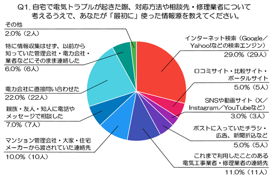 Q1. 自宅で電気トラブルが起きた際、対応方法や相談先・修理業者について考えるうえで、あなたが「最初に」使った情報源を教えてください。