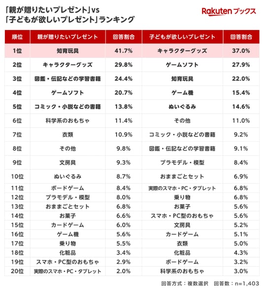 ・「親が贈りたいプレゼント」1位は「知育玩具」。一方で「子どもが欲しいプレゼント」1位は「キャラクターグッズ」。特に「ゲーム機」では、親子で順位に大きな違いも
