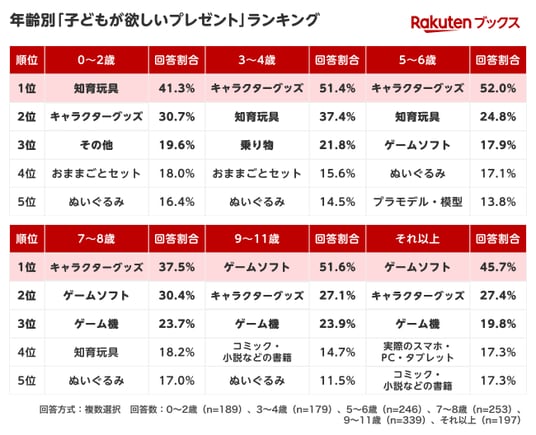 現在子育て中の「楽天ブックス」ユーザーに、「今年のクリスマスに子どもへプレゼントを贈る予定があるか」を聞いたところ、9割以上のユーザーが「はい」と回答しました。また、「子どもがクリスマスプレゼントに欲しがっている、または普段の様子から欲しがっているおもちゃのジャンル」を年齢別で聞いたところ、0~2歳では「知育玩具」、3~8歳では「キャラクターグッズ」、9歳以上では「ゲームソフト」がそれぞれ1位という結果になりました。