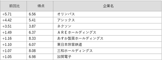 今回のIRサイトランキングにおいても、ウェブサイトのリニューアル、コンテンツの拡充や新規機能の追加等により、前回調査と比較して格段に充実したIRサイトが数多く見られました。そのなかでも特に大きく得点を伸ばした企業は次の通りです。