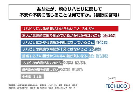 そして、リハビリを受けている親を介護するビジネスケアラーを対象に、「親のリハビリに関して不安や不満に感じることは何か」を尋ねる設問への回答では、1位が「リハビリによる効果がわからないこと」で34.5%、2位が「本人が意欲的に取り組めているかがわからないこと」で27.9%、3位が「リハビリにかかる費用が負担になっていること」で26.1%という結果になりました。この結果から、親のリハビリに関して不安や不満に感じることは、主に「リハビリによる効果がわからないこと」や「本人が意欲的に取り組めているかがわからないこと」であることがわかりました。