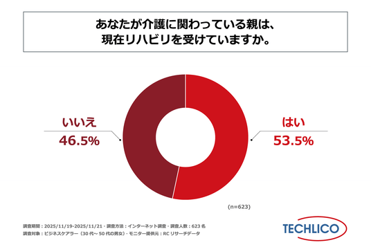 まず、「介護に関わっている親は、現在リハビリを受けているか」を尋ねる設問への回答では、「はい」が53.5%、「いいえ」が46.5%という結果になりました。この結果から、ビジネスケアラーの半数以上が、自身が介護に関わっている親は現在リハビリを受けていると回答していることがわかりました。
