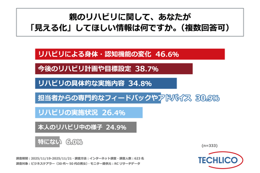 調査の最後、リハビリを受けている親を介護するビジネスケアラーを対象に、「親のリハビリに関して、あなたが“見える化”してほしい情報は何か」を尋ねる設問への回答では、1位が「リハビリによる身体・認知機能の変化」で46.6%、2位が「今後のリハビリ計画や目標設定」で38.7%、3位が「リハビリの具体的な実施内容」で34.8%という結果になりました。この結果から、親のリハビリに関して、「リハビリによる身体・認知機能の変化」の情報を“見える化”してほしいと考える人が最も多いことが明らかになりました。
