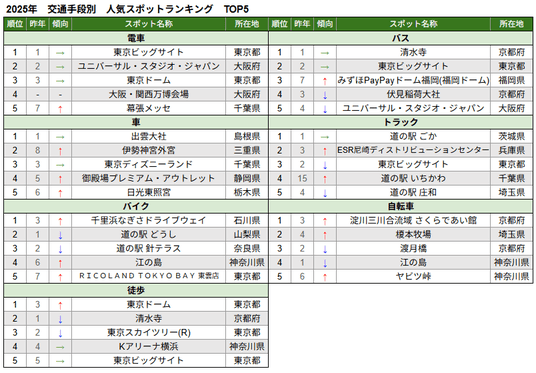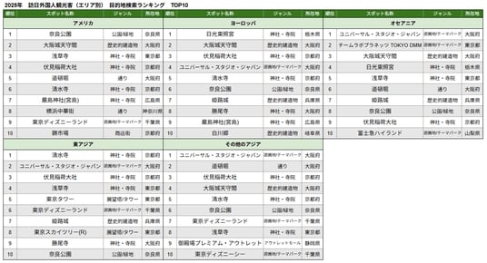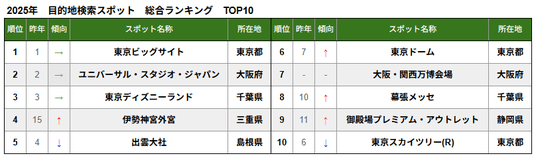 また、7位「大阪・関西万博会場」、27位「グランフロント大阪」が新たにランクインしたほか、79位「道頓堀」など大阪府のスポットの順位が上昇しており、大阪・関西万博開催による影響がうかがえます。