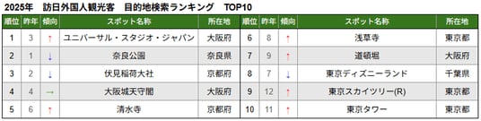 訪日外国人観光客向けナビゲーションアプリ『Japan Travel by NAVITIME』で検索された目的地のランキングを集計しました。2025年のランキングでは、「ユニバーサル・スタジオ・ジャパン」が1位となり、2位「奈良公園」、3位「伏見稲荷大社」、4位「大阪城天守閣」と続き、上位を関西(大阪・京都・奈良)の観光スポットが占める結果となりました。
