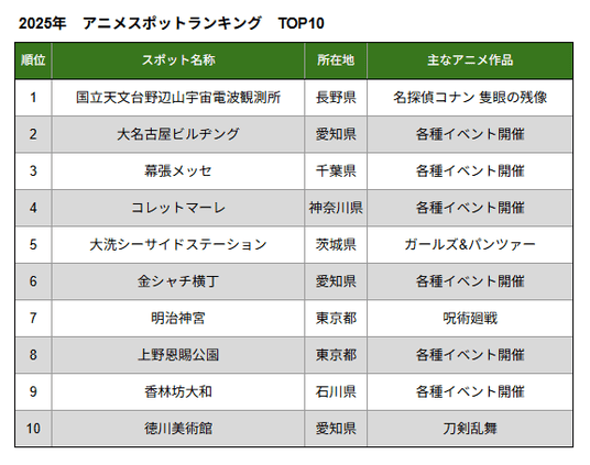 今年も、アニメの舞台となったスポットに加え、アニメ関連のコラボイベントが開催されたスポットを独自に調査し、集計しました。