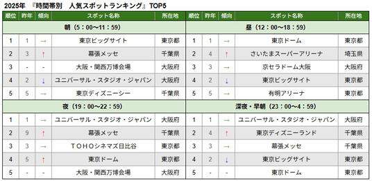 朝時間帯は、「東京ビッグサイト」が2連続で1位となり、3位に「大阪・関西万博会場」がランクイン。昼時間帯は、「東京ドーム」が2年連続で1位に。イベント会場やスタジアムがTOP10を占めました。夜時間帯は、「幕張メッセ」が順位を上げ、夜間のイベント施設の検索が増加しています。深夜・早朝時間帯は、「ユニバーサル・スタジオ・ジャパン」が2年連続1位となり、「東京ディズニーランド」も順位を上げました。全時間帯を通じて、遊園地/テーマパークやイベントホール/公会堂、スタジアム/球場が多くランクインし、それぞれの時間帯で、様々な目的やイベントの参加にあわせた移動傾向がうかがえます。