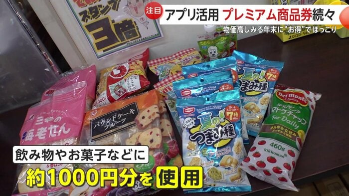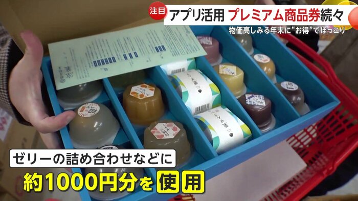 6000円分の買い物が無料となるが、この日は約1000円のゼリーの詰め合わせなどに商品券を使い、ちょっとしたぜいたくに充てた。