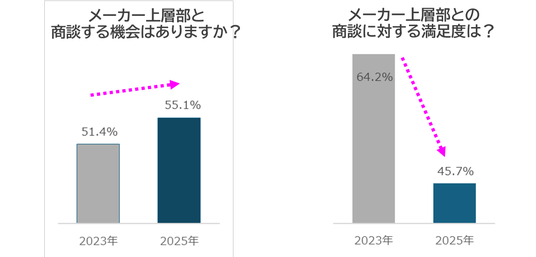 小売業とメーカー上層部の商談貴会の増減と、満足度の変化