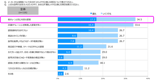 ▼メーカーからの提案について「イヤだ」と感じる内容:1位:「他チェーンと同じ内容の提案」 34.5%