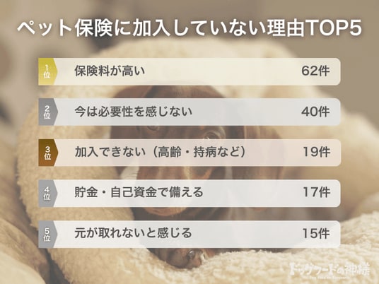 - ペット保険に入らない理由1位は「保険料が高い」だった。また、万が一の時は貯金で備える派の存在も少なくない。