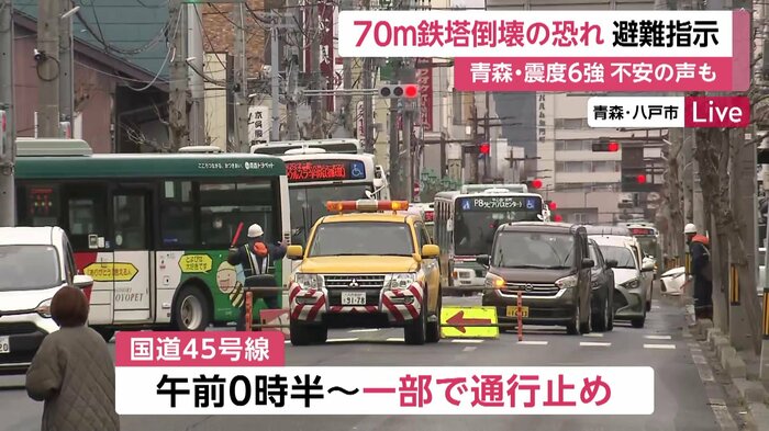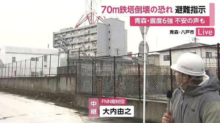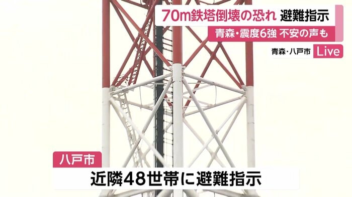 8日に青森・八戸市で最大震度6強を観測した地震の影響で、市内にある鉄塔が損傷したため、付近の48世帯に避難指示が出ている。