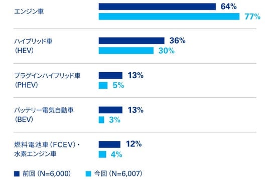 ・ 日本の消費者は次回車を購入する際、エンジン車77%、HEV30%の順で検討すると回答。前回調査と比較して、エンジン車の購入検討意向が増加し、PHEVやBEVは大幅に減少した