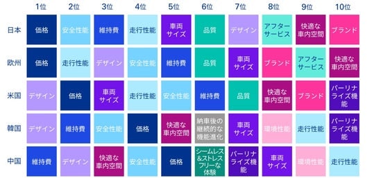 ・ 所有する車のブランドの地域によって、消費者が車購入時に重視するポイントは明確に異なる