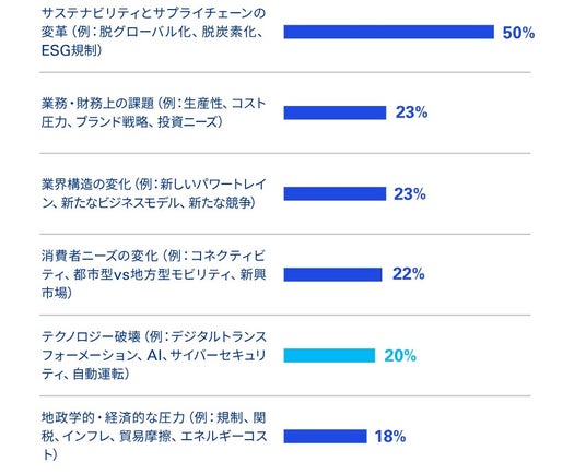 図1:今後3年間で自動車業界に最も大きな破壊をもたらす要因は次のうちどれだと思うか(2つまで選択可)