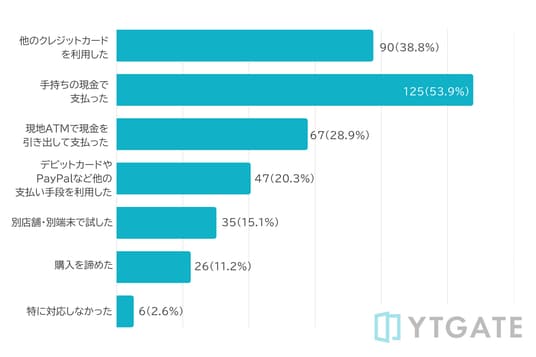 質問9:海外でクレジットカードが使えなかった場合、どのように対応しましたか?(n= 232/複数選択可)