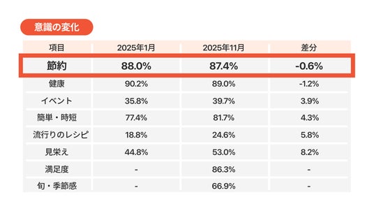 「節約」への関心度は、2025年1月(88.0%)と11月(87.4%)の調査結果ともに約9割の高い水準を維持。特に1月と11月の差分はわずか-0.6%と、他の関心項目と比較して最も小さい変化に留まっています。