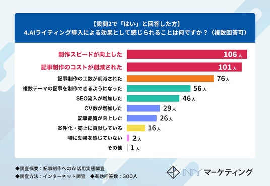 また、続けて同じくAIライティングを活用している方に「AIライティング導入による効果として感じられることは何ですか?(複数回答可)」と質問したところ、『制作スピードが向上した』が46.1%(106人)で最多回答となりました。