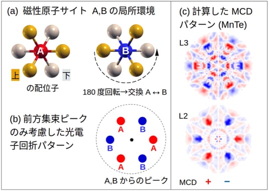 図2:(a)MnTeの最隣接構造。(b)A,Bからの主なPEDピーク。(c) 計算結果:RPED-MCDパターン