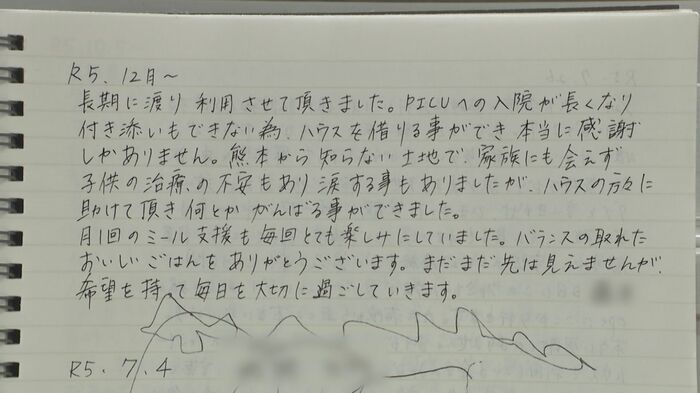 「PICUへの入院が長くなり、熊本から知らない土地で家族にも会えず、子供の治療の不安もあり、涙することもあったが、ハウスの方々に助けて頂き、なんとか頑張ることができました。本当に感謝」(利用者Aさん:2023年12月)