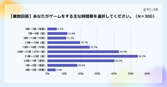 ゲームプレイする時間帯の調査では、21~23時が54.3%で最多の結果となりました。