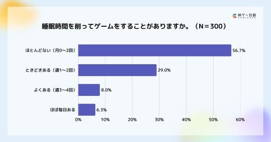 睡眠時間を削ってゲームをすることは、56.7%がほとんどないと回答しました。ときどきあると回答した人は29%存在し、週3回以上で睡眠時間を削ってゲームをする人は14.3%いることが分かりました。
