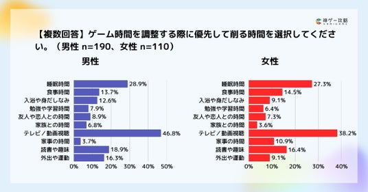・ゲームプレイのために優先して削る時間は、男女共にテレビ/動画視聴時間が最多