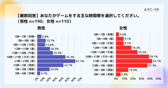 ゲームプレイする時間帯の調査では、男女差はほとんどない結果となりました。