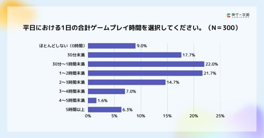 平日の1日当たりのゲームプレイ時間は、30分~1時間が22%で最多という結果でした。次点で1~2時間の21.7%であり、7割弱が2時間未満という結果になりました。