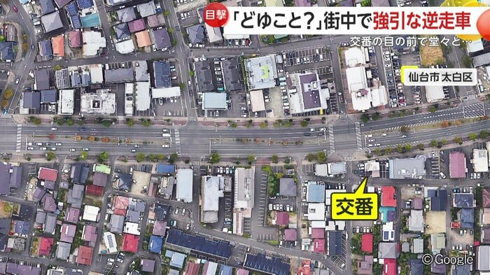 逆走が撮影された現場は交番の目と鼻の先だ。何台もの車の間を、スピードを落とすことなく走り去る様子が確認されている。