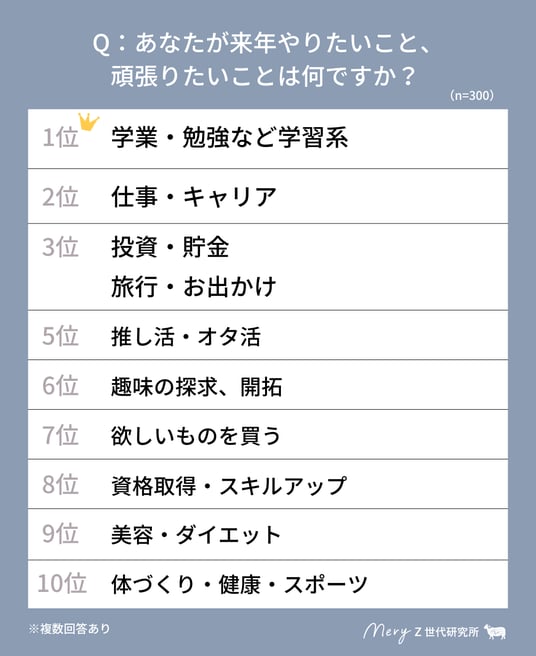 1位に「学業・勉強など学習系」、2位に「仕事・キャリア」、3位は同率で「投資・貯金」と「旅行・お出かけ」という結果になった。