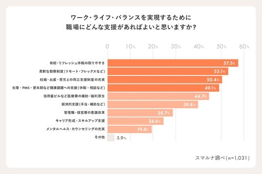 最後に、ワーク・ライフ・バランスを推進するために職場にどのような支援があるとよいか尋ねたところ、「有休・リフレッシュ休暇の取りやすさ」が57.5%、「柔軟な勤務制度(リモートワーク・フレックスなど)」が53.1%となりました。休暇制度や勤務制度の整備を求める声が多い一方で、「妊娠・出産・育児との両立支援制度の充実」が50.4%、「生理・PMS・更年期など健康課題への支援(休暇・相談など)」が49.1%となり、制度面とあわせて女性特有の健康面でのサポートを求めるニーズも高いことがわかりました。