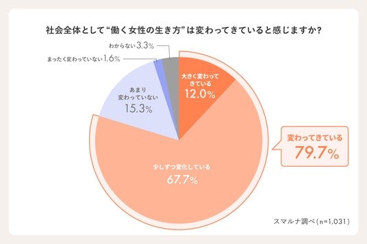 また、社会全体として女性の働き方が変わってきていると感じるかを尋ねたところ、「変わってきている」と回答した人は79.7%となりました。「少しずつ変化している」と捉える人が多く、急激ではないものの、価値観や働き方のあり方が徐々に変化していると感じている様子がうかがえます。